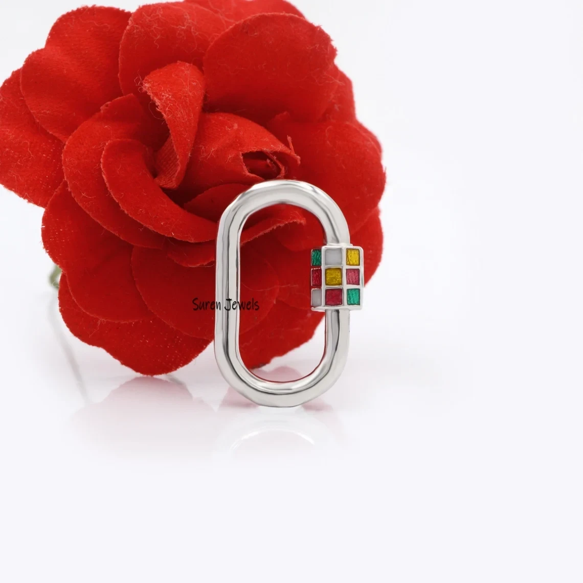 Upgrade your jewelry collection with this 14K gold blue enamel carabiner lock. Designed for durability and elegance, this oval-shaped charm holder is perfect for necklaces and bracelets, adding a modern touch to your style.
