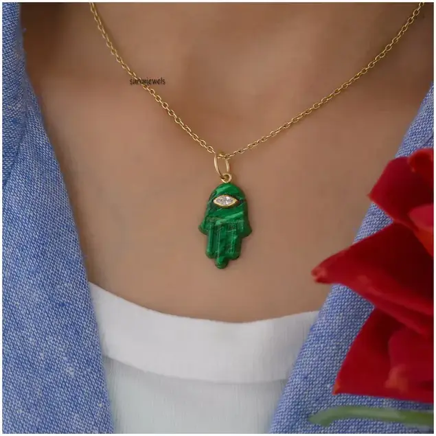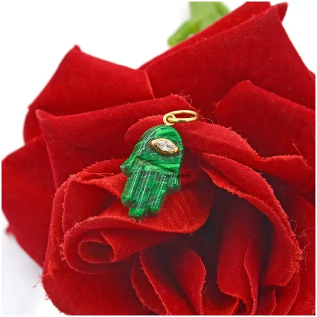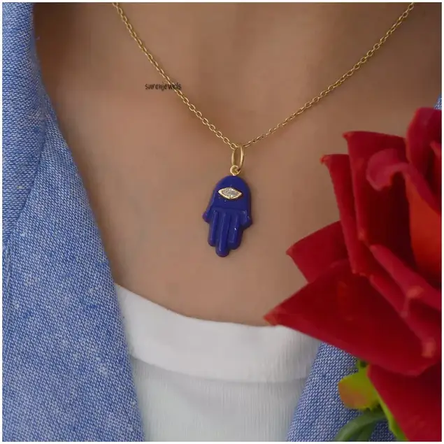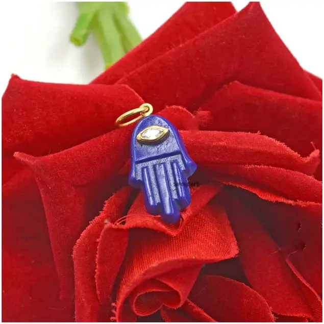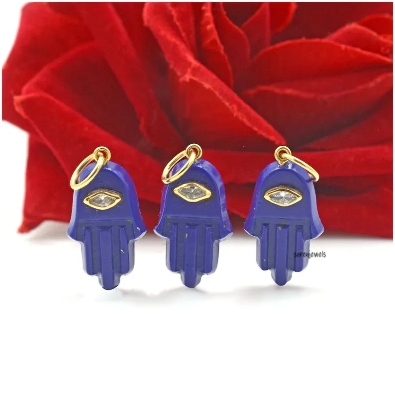 This 14K gold carved lapis lazuli Hamsa hand pendant symbolizes luck and protection. A designer gemstone charm, perfect as a statement piece or layering accessory. Wholesale available at Suren Jewels.