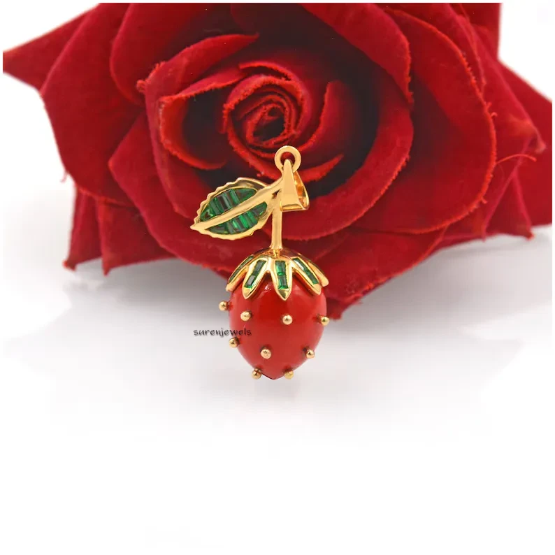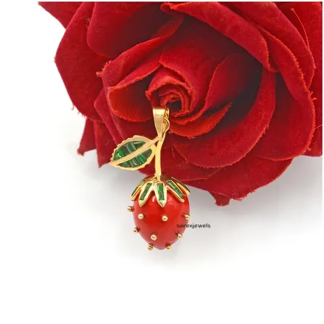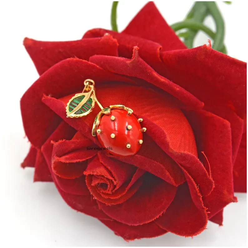 Add a touch of sweetness with this 14k gold gemstone strawberry pendant. A beautifully crafted red berry charm, perfect for necklaces or bracelets. Ideal for wholesale buyers seeking quality jewelry.
