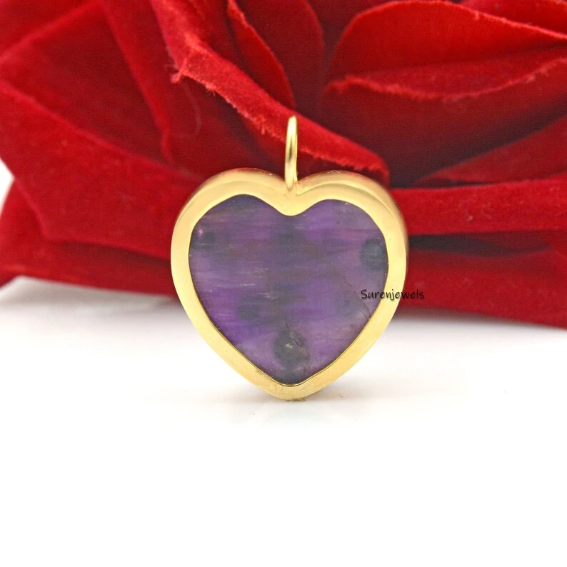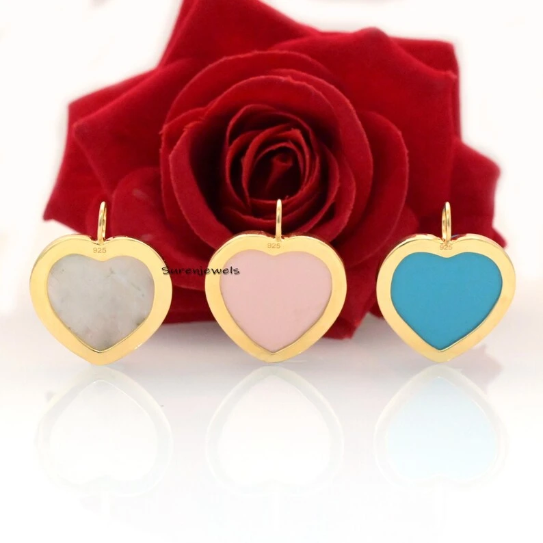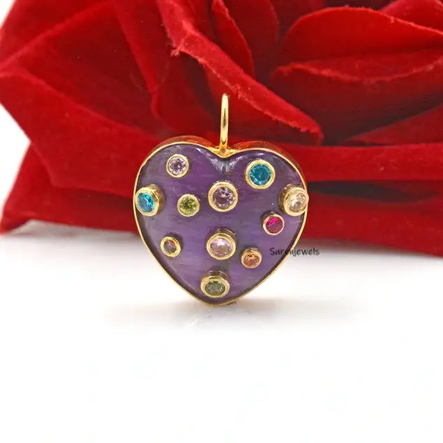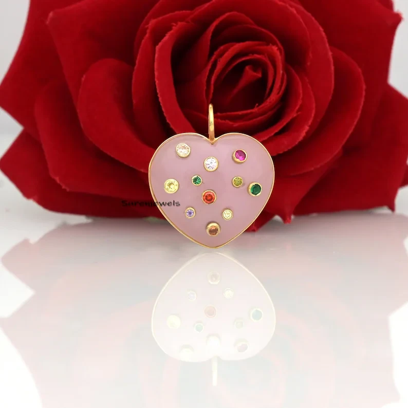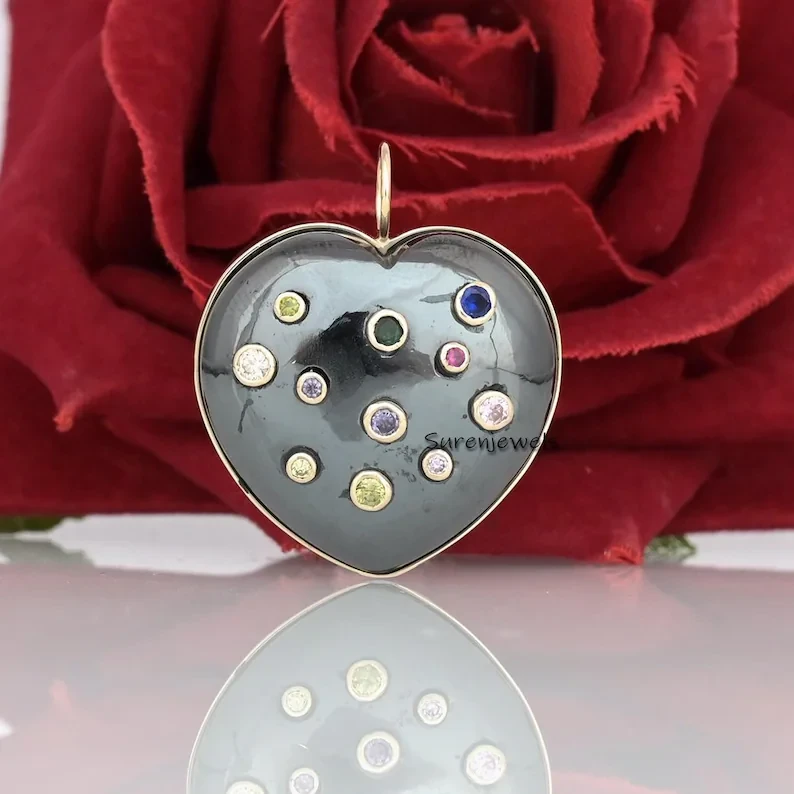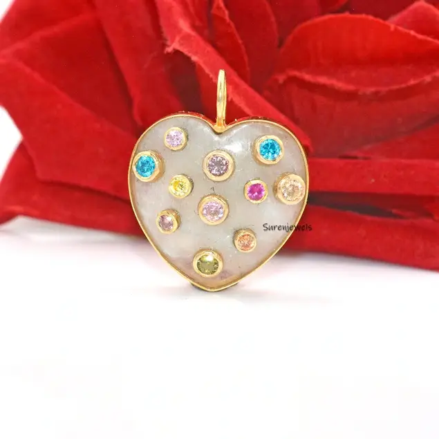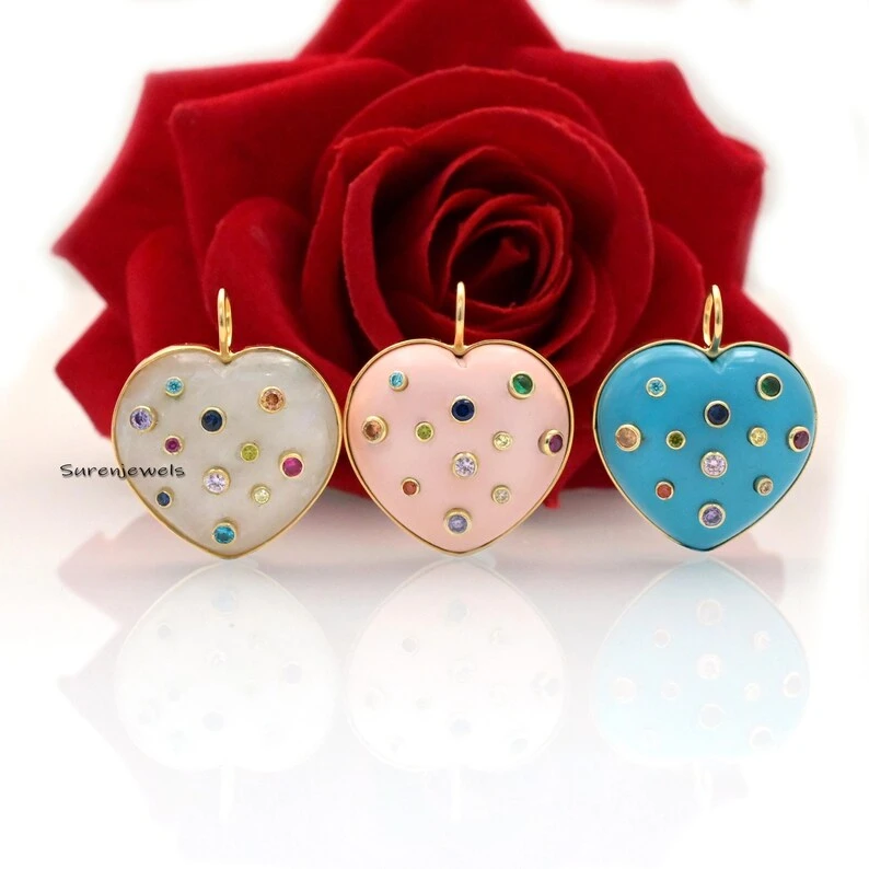 This exquisite 14K gold heart pendant features hand-carved multi-stone details in MOP, coral, and malachite. A designer statement piece, perfect for charm holders, necklaces, or unique jewelry collections.