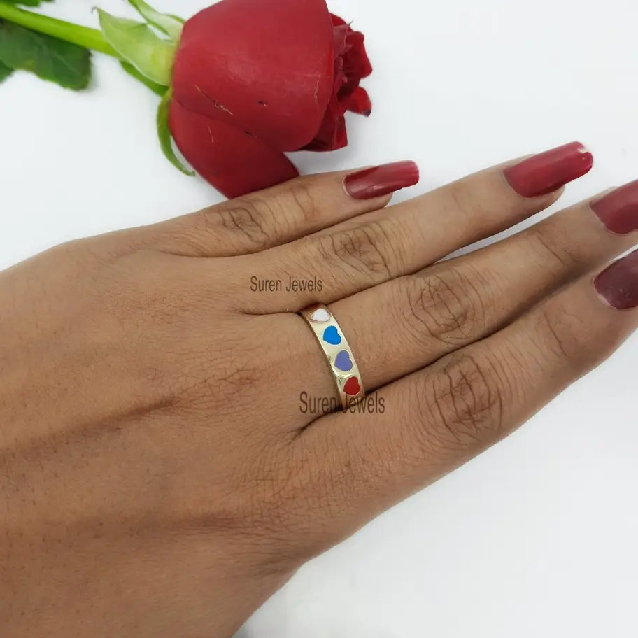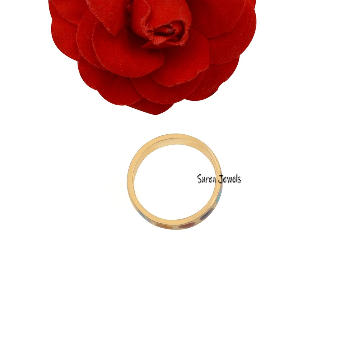 Suren Jewels presents a stunning 14K gold multicolor enamel band ring. This vibrant rainbow enamel ring adds a bold touch to any collection, making it perfect for stacking or wearing solo. Wholesale available.