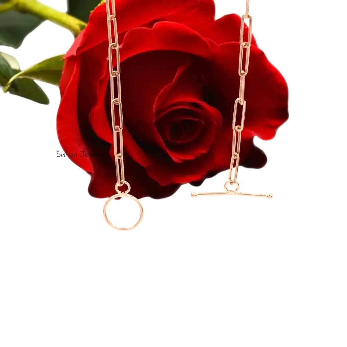 This elegant 14K gold paperclip carabiner chain necklace features a secure toggle clasp, offering a stylish blend of rose and yellow gold. Perfect for layering or standalone wear, it’s a must-have for modern jewelry lovers.