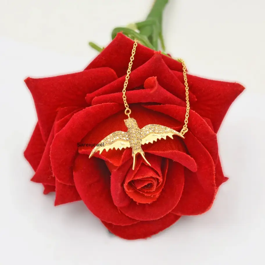 Add elegance to your collection with this 14K silver diamond swallow charm pendant. Featuring sparkling gemstones, this designer bird charm is perfect for necklaces and bracelets. Wholesale available.