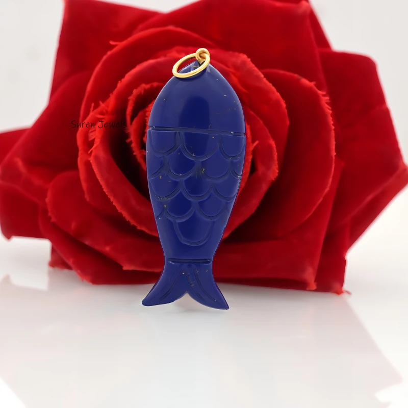 14K Yellow Gold Lapiz Lazuli And White CZ Fish Pendant