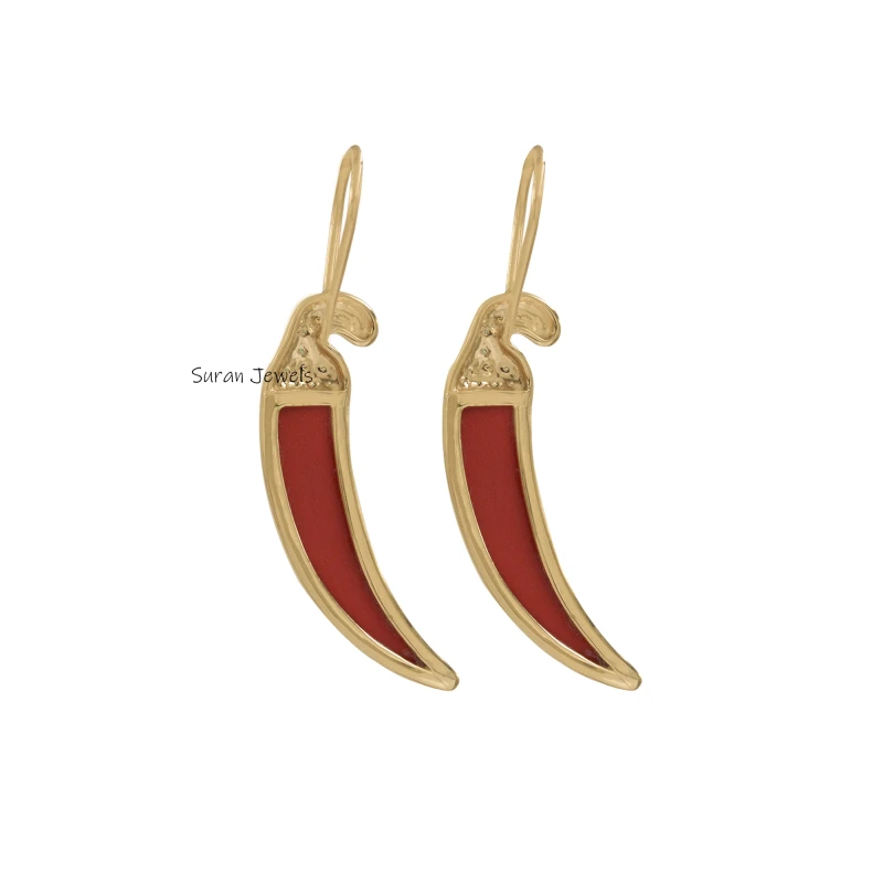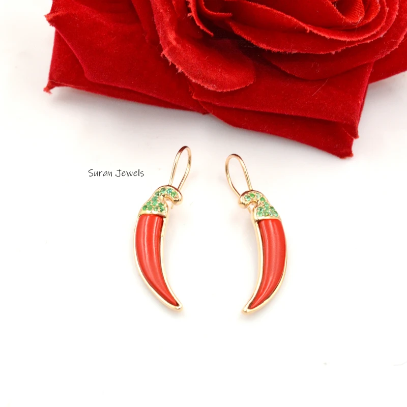 Elegant 925 silver earrings with gold plating, featuring coral red chili and emerald stones. A unique blend of charm and sophistication, perfect for adding a bold statement to any jewelry collection.