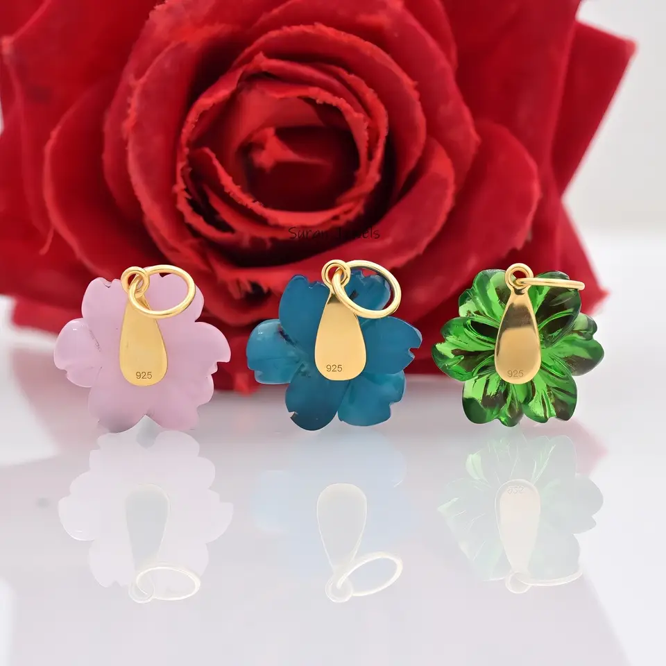 Beautifully hand-carved 925 flower pendant, featuring detailed floral design and natural gemstone accents. Available in silver and gold plating, perfect as a charm or statement piece. Ideal for custom and wholesale jewelry buyers.