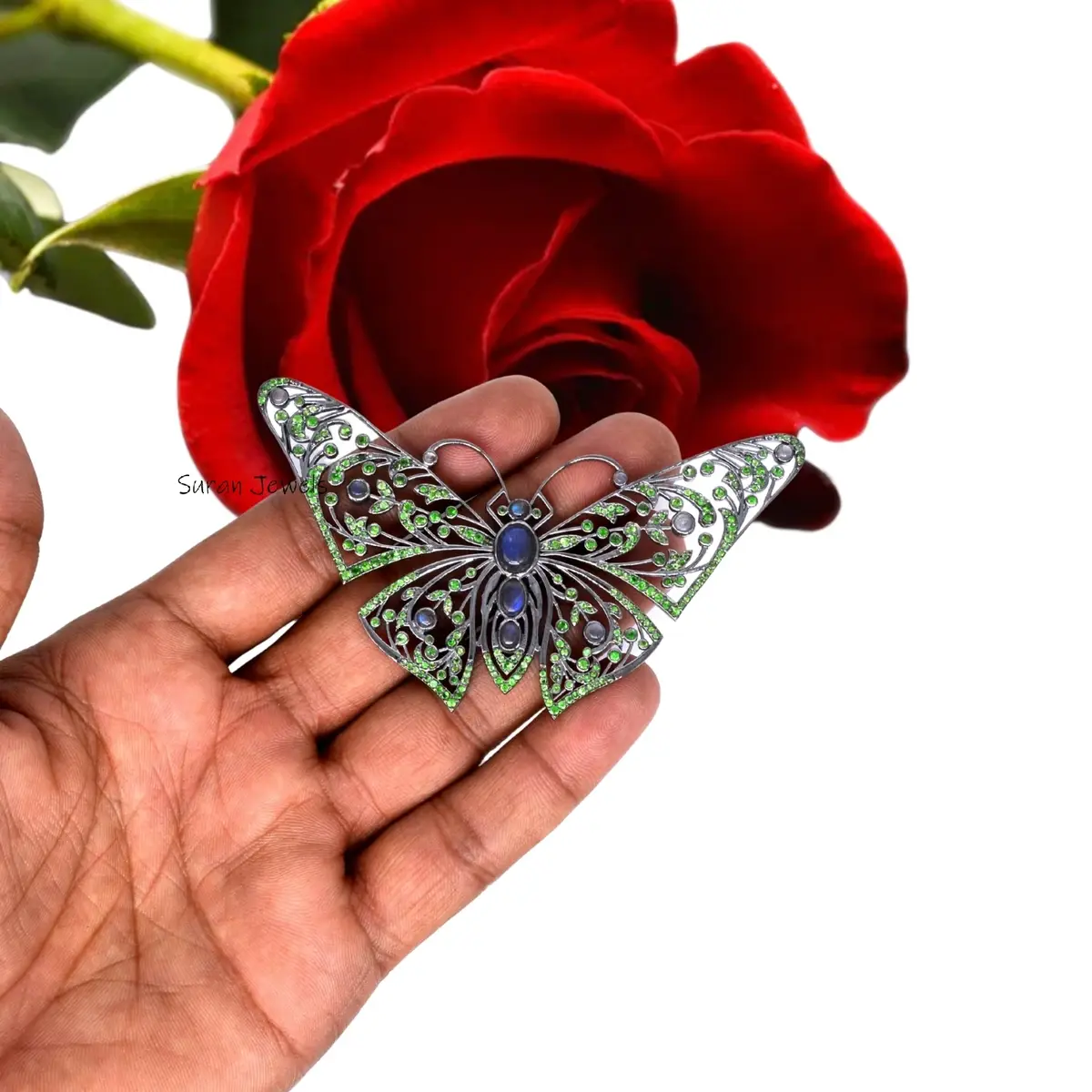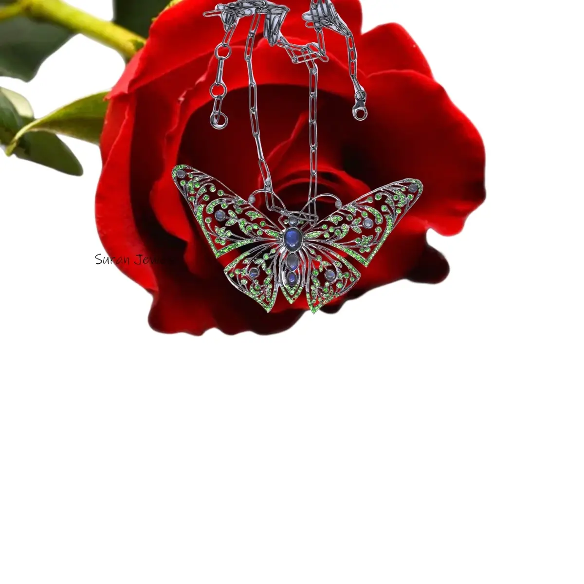 Elevate your collection with this 925 Rhodium Butterfly Pendant, featuring shimmering Blue Labradorite and Tsavorite gemstones in a silver and yellow gold finish. A perfect fusion of elegance and fine craftsmanship from Suren Jewels.