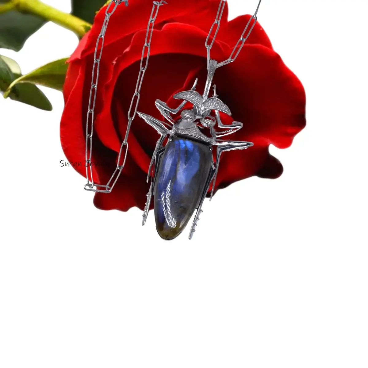 Add a whimsical charm to your collection with this 925 silver bug pendant, rhodium-plated and detailed with labradorite, blue enamel, and vibrant gemstones. Perfect for charm holders, necklaces, or custom jewelry.