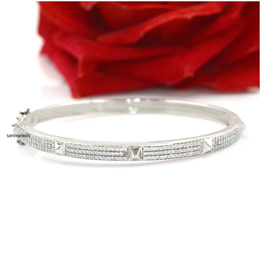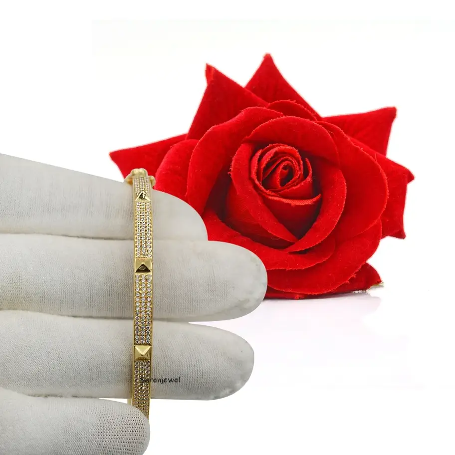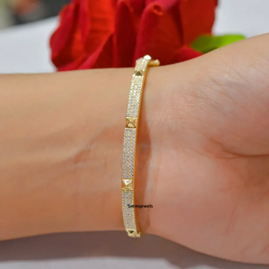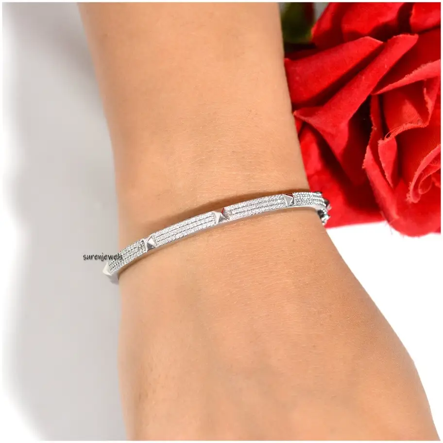 Crafted in 925 sterling silver, this Pyramid Spike Bangle features a bold, diamond-studded rivet design. Inspired by Egyptian pyramids, its sleek, edgy style makes it a perfect statement piece for modern jewelry lovers.
