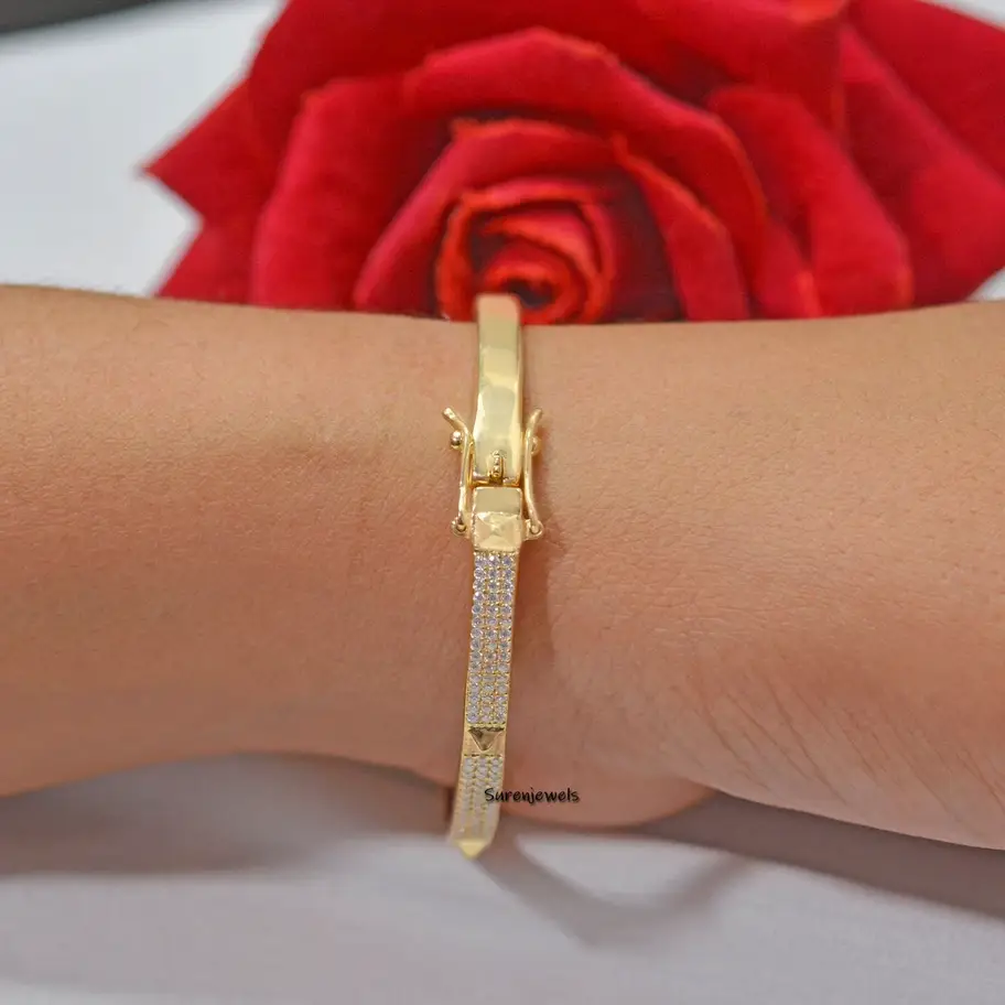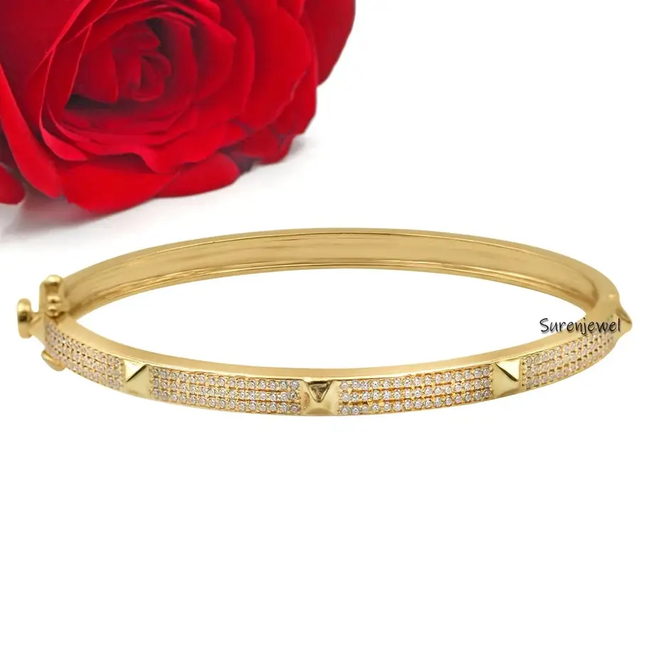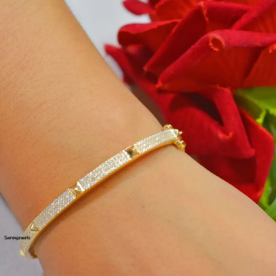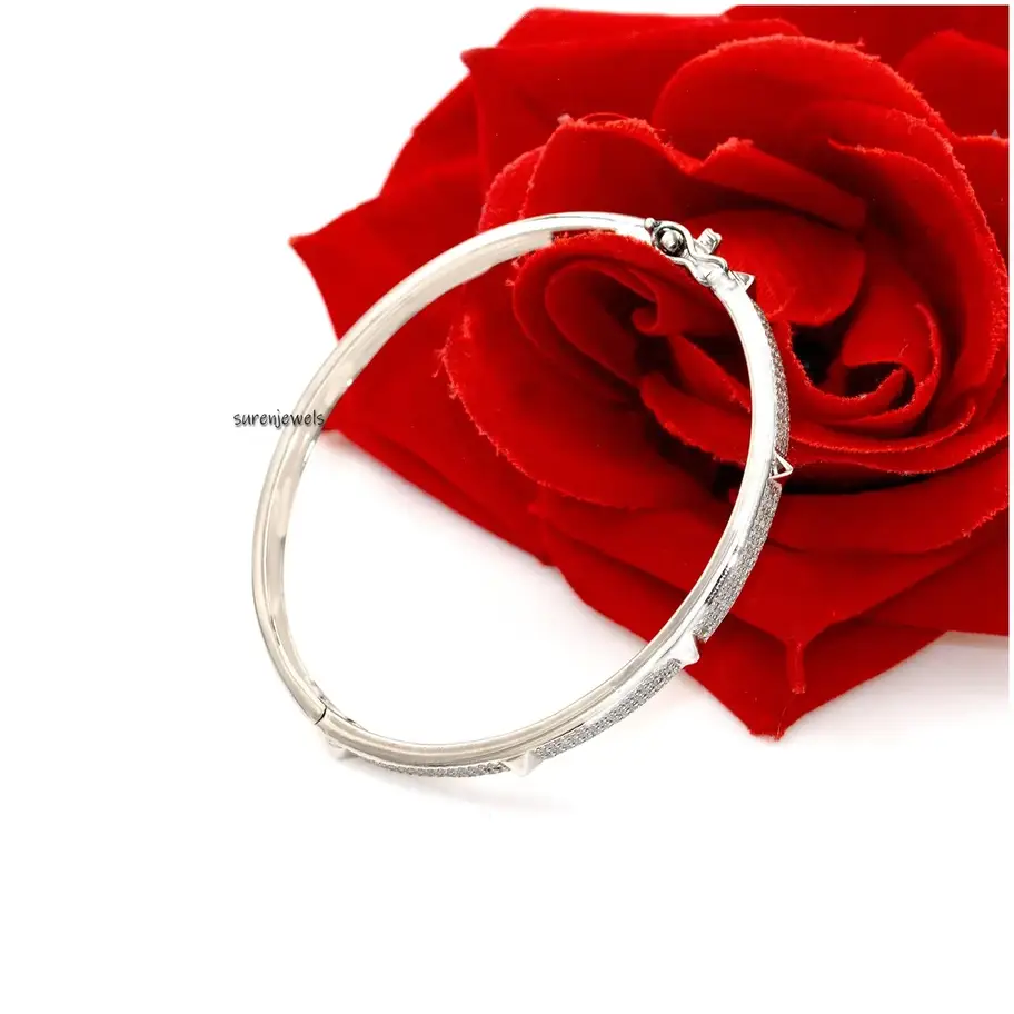 Crafted in 925 sterling silver, this Pyramid Spike Bangle features a bold, diamond-studded rivet design. Inspired by Egyptian pyramids, its sleek, edgy style makes it a perfect statement piece for modern jewelry lovers.