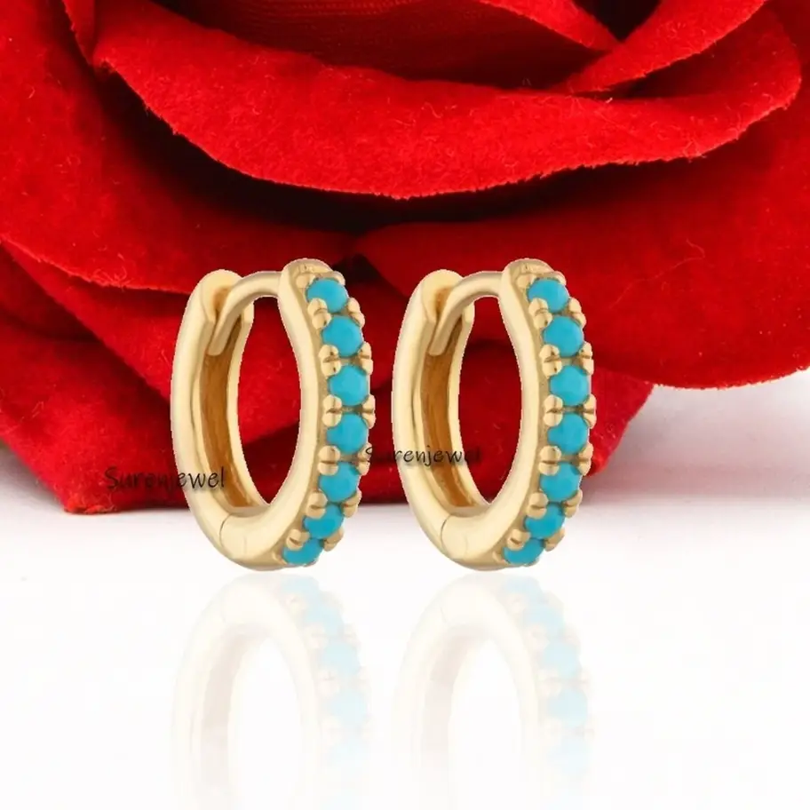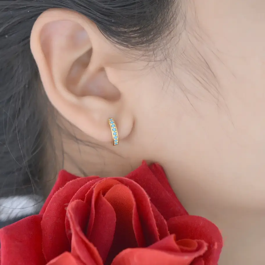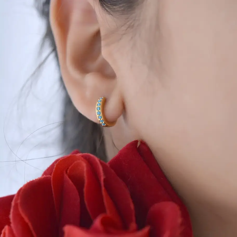 Elegant 925 silver turquoise huggie earrings, perfect for any occasion. These handmade turquoise hoop earrings add a pop of color and charm. Wholesale is available from Suren Jewels.